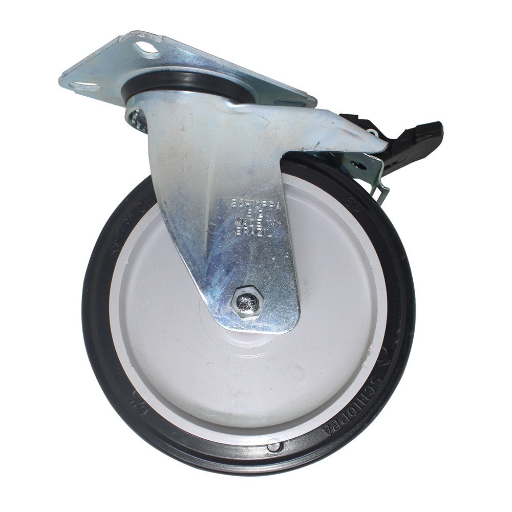 Rodízio Placa giratório Schioppa, garfo e placa unidos por um rebite central reforçado. Com Freio. Indicados para cargas e percursos médios, tração manual ou motorizada à baixa velocidade, em pisos semi conservados. Capacidade de 85 quilos.